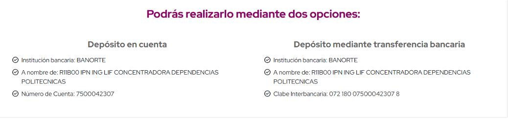 - Pago de $160.00 pesos comprobante en formato PDF, (Favor de poner los datos con el nombre del alumno, número de boleta, teléfono y/o correo electrónico). Es importante mencionar que el pago tiene una vigencia de 30 días, por disposición de la secretaria de Hacienda; para los casos en los que los alumnos presenten comprobantes de pago de BANCO AZTECA, no se recibirán dado que esta institución bancaria, después de 24 horas retira el depósito.
